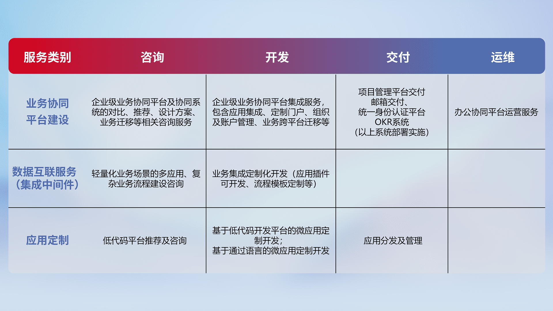 针对钉钉、、企微、、、IDaas等平台级产品提供产品的规划、、方案、、、交付、、定制化开发等服务,,,实现如统一协同办公、、智能客户服务、、、、混合会议管理、、、、智能数据查询、、等业务场景,,,实现数字化转型。。